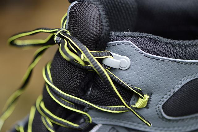 本鞋款為了減輕重量,因此在鞋配件上動(dòng)了一點(diǎn)無(wú)傷大雅的改變。首先是鞋帶鉤環(huán)僅有一對(duì),且采用塑膠材質(zhì),但在腳踝部分擁有較高保護(hù)與固定的前提下,測(cè)試期間發(fā)現(xiàn)這對(duì)輕裝徒步來(lái)說(shuō)并無(wú)太大的影響,反而在鞋子的穿脫上相當(dāng)?shù)姆奖恪A硪粋€(gè)部分則是鞋面位于腳趾頭的上方部位,并沒(méi)有較硬的材質(zhì)做保護(hù),而權(quán)衡的彌補(bǔ)方案則是將鞋尖處做較大角度的上揚(yáng),并將大底的延伸厚度增加,以達(dá)到保護(hù)腳趾避免踢到硬物的效果。