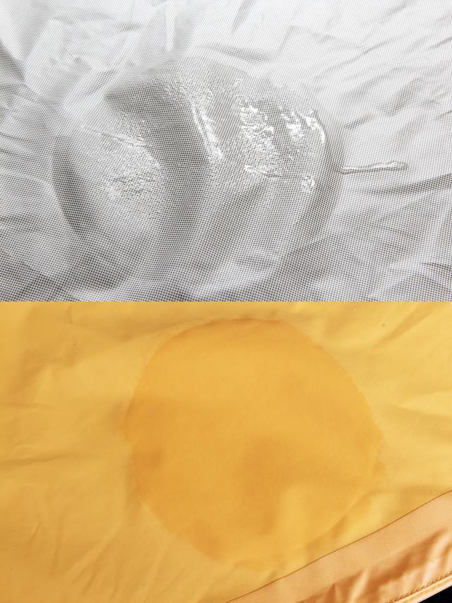 實測經驗發現,OutDry Extreme零滲透抗水布的表面非常光滑,也沒有DWR防潑水涂層那種細絨感,所以臟的印跡幾乎無法深入附著,拿擰干的濕毛巾擦拭,臟污就輕松去除了。