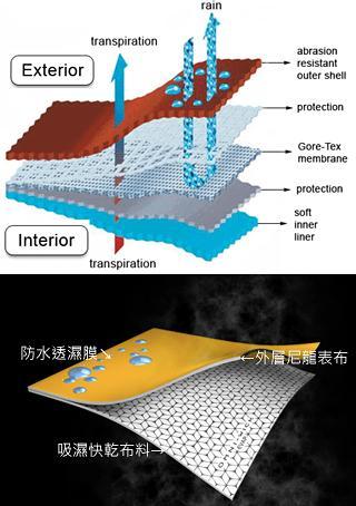 上:一般稱為「三層防水透濕布料」;下:Columbia的「OutDry Extreme兩層透氣布料