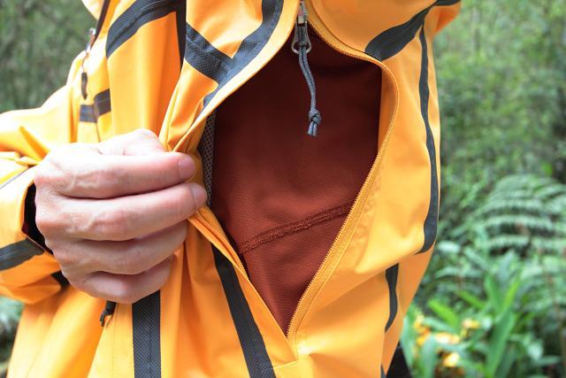 這種設計在春夏季防水外套中并不少見,是利用腋下開口增加通風,又能避免雨水流入的問題。當然,這種構造并不適合在大雨中開啟,或是雨中做出舉手攀爬的動作,但若是在天氣濕熱的微雨狀態下行進,這種設計就能增加服裝內的對流,減少外套內的悶熱感。