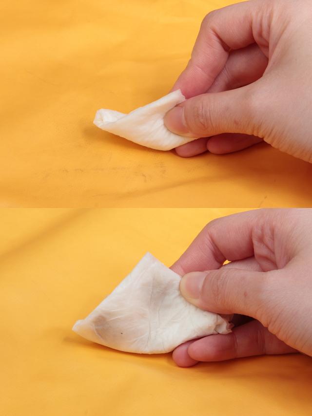 上:直接使用紙巾沾水,擦拭。下:不一會就被去除,而且完全不需要使用任何清潔劑。