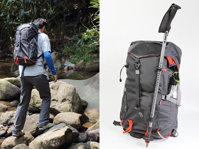 左:Scrambler 30是一款兼具戶外與都會需求的小背包。右:左右兩邊都有側袋可放置水壺、小腳架或雨傘,以及可以勾掛登山杖的束帶與吊環