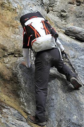 這次測試的場景,算是在短時間的「硬行程」,前往的地區,必須先由登山口上攀近300米,再陡降800米,其中陡降的這段路程,除了約20分鐘的路程比較和緩外,其他都是陡下切的路段,加上由中海拔往低海拔下切,植被越來越密,并不算好走。回程的路,恰恰是大相反,先陡上再進入樹林下切。至于兩天行程中,小段的溯溪、攀巖,大概都用上了,算是徹底體驗了這條褲子的性能。