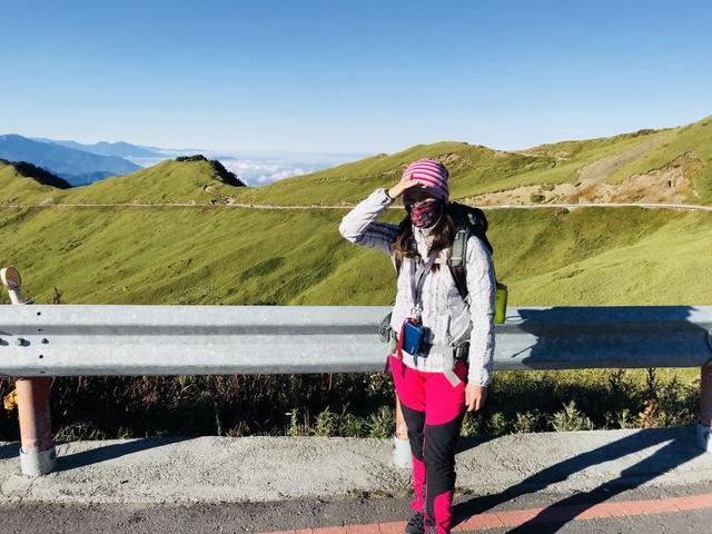 離開后就沒有任何遮蔽物了,直奔山頂已略微起風,會感覺到冷,于是將Gore-Ter外套加羽絨衣全都穿上,避免溼的衣服遭受風吹帶走體溫。下午的北峰跟上午的主峰比起來,冷了很多很多,索性就把臉整個包起來保暖~(在這兒提醒,登山就是需要視行進情況,隨時穿穿脫脫調節體溫,千萬不要硬撐,隨時保持溫暖才安全喔。)