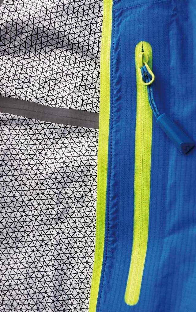 這件超輕沖鋒衣采用eVent材質的薄膜,和Gore-tex最大的不同,是eVent可以直接透氣,不需太大的內外溫度、壓力差就可以達到透氣作用,所以就防水透濕的材質來說,eVent其實比Gore-tex更好,只是知名度不高而已。
