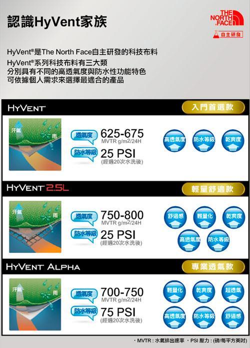 HyVent是THE NORTH FACE研發的科技布料,其中HyVent 2.5L屬于輕量舒適款,強調「舒適感」、「輕量化」、「干爽度」、「高透氣」、「防水」。