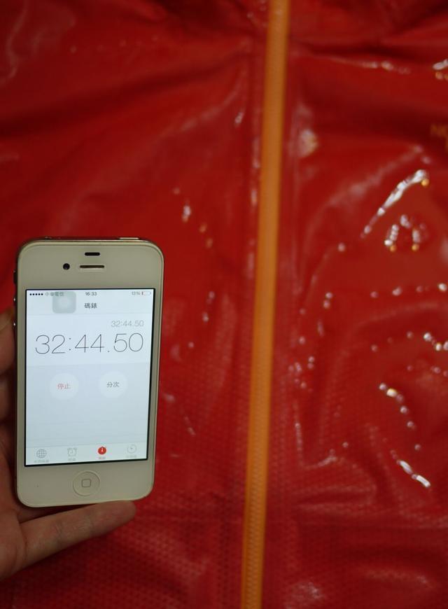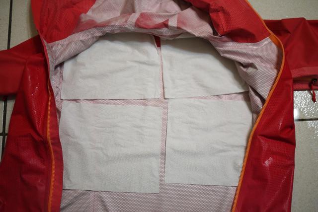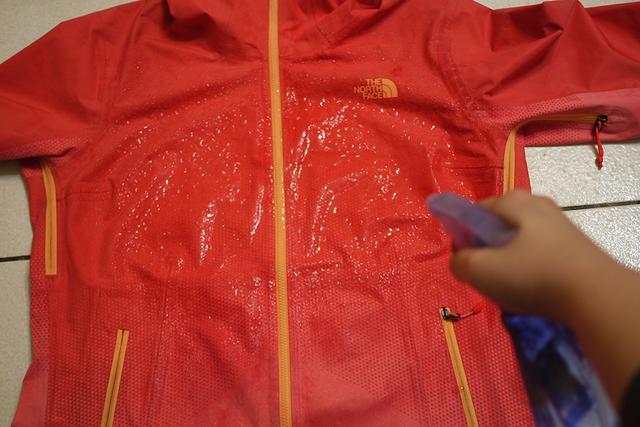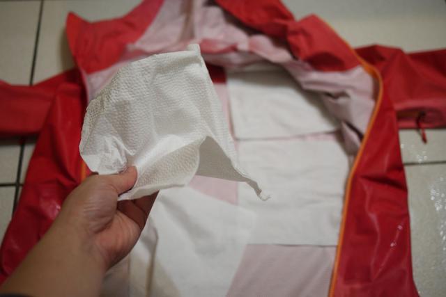 2. 將拉鏈拉上后開始狂噴水,讓有放衛生紙部位的外套外面全濕,甚至積水。