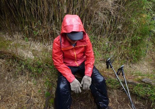 當箭竹是濕的時候,比下陣雨或毛毛雨還要恐怖,像是在水中游泳一樣,鐵定是全身濕。而這次行程中第五天,一整天下著雨,路上的箭竹呈現無敵濕的狀況,而且箭竹很密,需要用身體去把它撞開才能往前,也因為大部分都在箭竹之中,根本沒有風,走了超過10小時,衣服僅是被汗水弄濕,就是那種摸起來微微濕,這樣的表現算是令人滿意。
