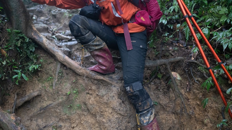 因為下大雨的關(guān)系我們直接換上雨衣,我的雨衣是長版的,加上Kaipak Trousers Curved W 也有一定的防潑水性,我便沒有額外套上雨褲,路上雖然沒有很陡的陡升,可一開始的路,也有不少需要跨大步的高低落差處,但歸功于立體剪裁的設(shè)計與臀部、胯下和膝后都有拼接彈性布料給予極大的活動性。
