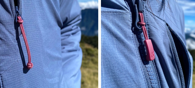 這件外套有雙向前拉鏈、胸前拉鏈口袋、兩側(cè) YKK 側(cè)邊拉鏈口袋,雙向前拉鏈對(duì)有在攀巖的我非常實(shí)用,幫隊(duì)友確保時(shí)如果穿著外套,有雙向拉鏈真的非常方便,外套就不用重新扎到吊帶里,胸前口袋可以放手機(jī),方便拿取。而且拉鏈頭還是繩結(jié),配色也非常好看。