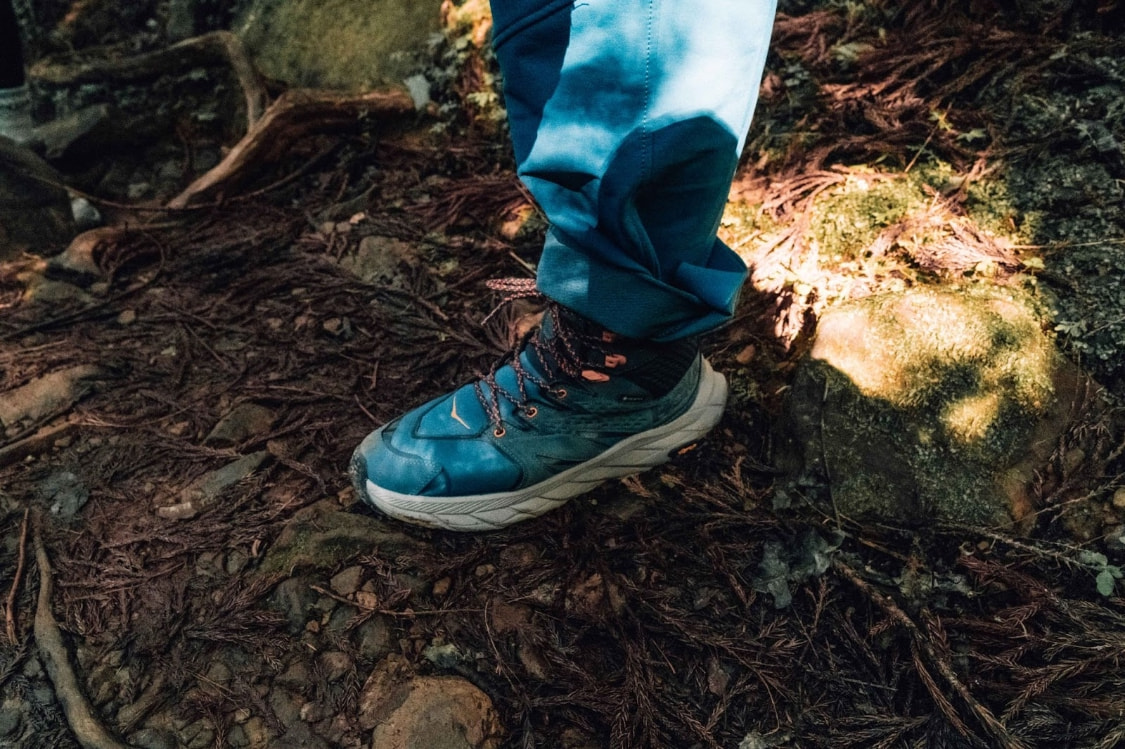 在我剛拿到 ANACAPA 時,有兩個感想,第一個是關于外觀配色,我收到的這雙 RTOS 藍綠/外太空藍,和大家印象中 HOKA 家的徒步鞋配色很不一樣,是比較跳一點的配色,一開始有點小不習慣,但我其他的登山鞋多以沙漠色、原皮色為主,所以這雙鞋算是我少數偏亮色系的登山鞋款,就增加了戶外活動不同的穿搭風格。 第二個是拿起來的重量,真的非常的輕,男鞋單支重量僅有450g左右,是我所使用過的中幫輕量鞋款當中,相當輕的鞋款。