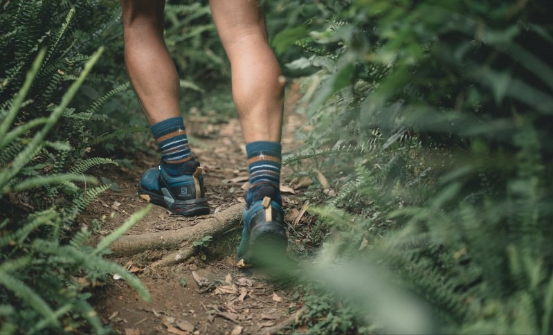 像是在這種下坡不平整山徑,最容易產生足底內外翻的情形,即便穿著的是低幫款式,實際走起來蠻明顯感受到X Ultra 4的整體鞋底設定給予的支撐力和側面的穩定保護性都超級扎實。