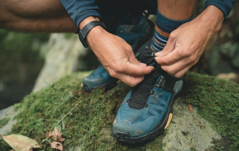 X Ultra 4 外觀線條簡約俐落,配色上局部跳色的設計也很搶眼,幾乎看不出前一代的“機能味”,而是多了點潮流時尚感。這次特地選了一雙有別于一般登山鞋的亮藍色,在山徑里相當耀眼明目,若穿梭在都市里走跳也不會顯得突兀。