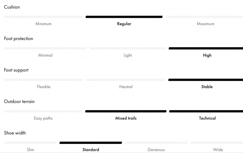 在鞋款介紹的最后附上一張國外官網X Ultra 4 GTX的規格定位給大家做參考,可以看到原廠也相當強調其保護及支撐性,在避震上則非常適合中等負重的行程使用。