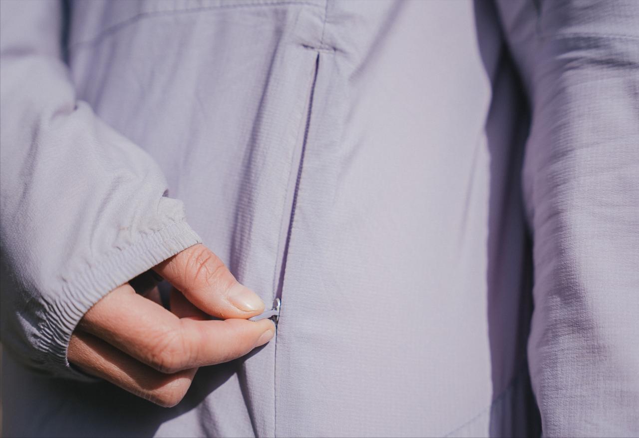 實(shí)測(cè)我穿的男款S號(hào)僅126g,女友穿的女款XS號(hào)僅113g。自體收納到內(nèi)側(cè)口袋時(shí)的大小大概就是一支手機(jī)的長(zhǎng)寬而已,和我們攜帶的輕量防水外套在重量和收納體積上還是有些微的差距,當(dāng)然重點(diǎn)是透氣性差異很大。