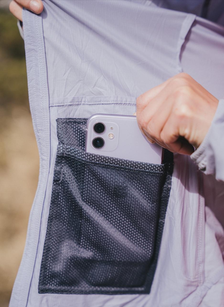 外套右邊內(nèi)側(cè)內(nèi)建了一個(gè)網(wǎng)布?袋,主要是用來反折收納整件外套使用的,而這個(gè)口袋的大小可以輕輕松松放入iPhone 11手機(jī),所以如果是外出旅行要放貴重物品也是沒問題的。