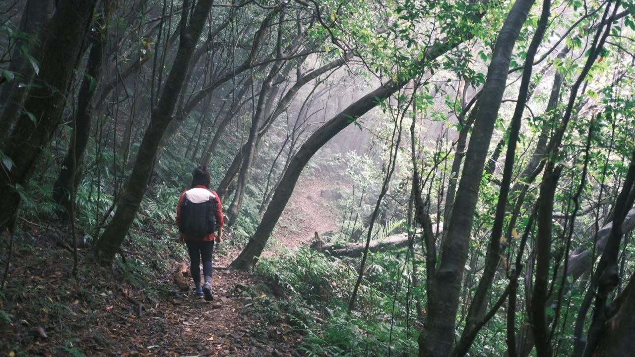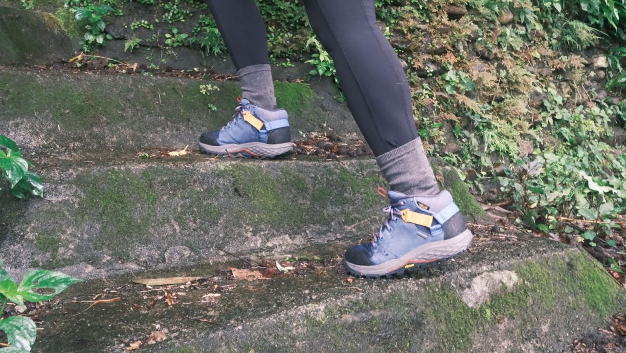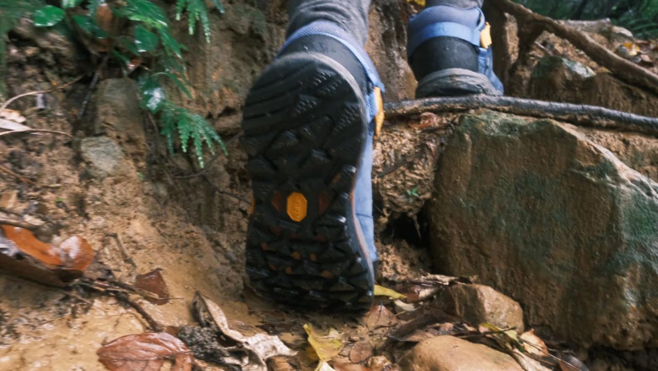 走了一段公路后,鞋的考驗就正式開始啦!先來個石階梯輕松走~然后沒多久就出現了濕滑泥濘石階路段,此時正在下著“大雨”。因為這雙鞋的鞋底是Vibram Megagrip黃金大底,在干濕地形有卓越的抓地性及耐磨度,所以在雨天行走在層層的石階也可以不怕滑倒,然我感到滿滿的安全感。