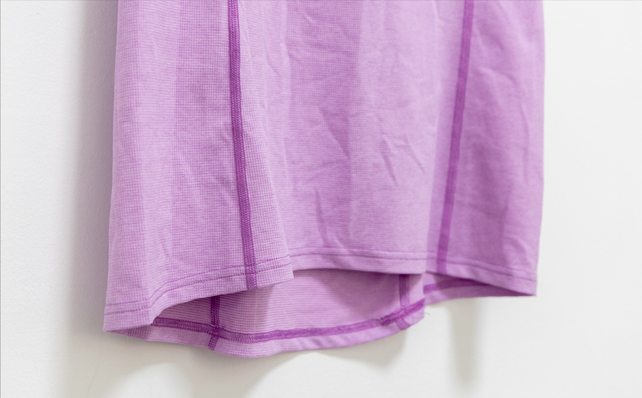 短袖的下擺有不對稱的前短后長剪裁,這個設計可以加強身體伸展時的包覆保護