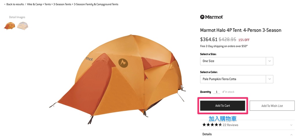 下一件商品...小編如法炮制得找到了土撥鼠(Marmot)的4人帳篷~ 一樣加入購物車
