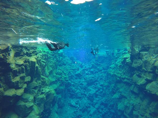 除了腳踏兩大板塊,你還可以在辛格維利爾國家公園內的絲浮拉大裂縫(Silfra)體驗清澈無比的水下世界,在兩大板塊之間潛水、浮潛,結合成黃金圈+大裂縫浮潛一日游。