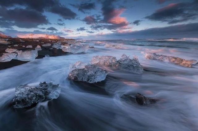 在杰古沙龍冰河湖旁的鉆石冰沙灘上,被海洋拋棄的冰塊孤獨停靠在黑沙灘上,歷經打磨后如鉆石般閃爍。在冰塊間徐徐行走,與世界的蒼茫神秘同在。