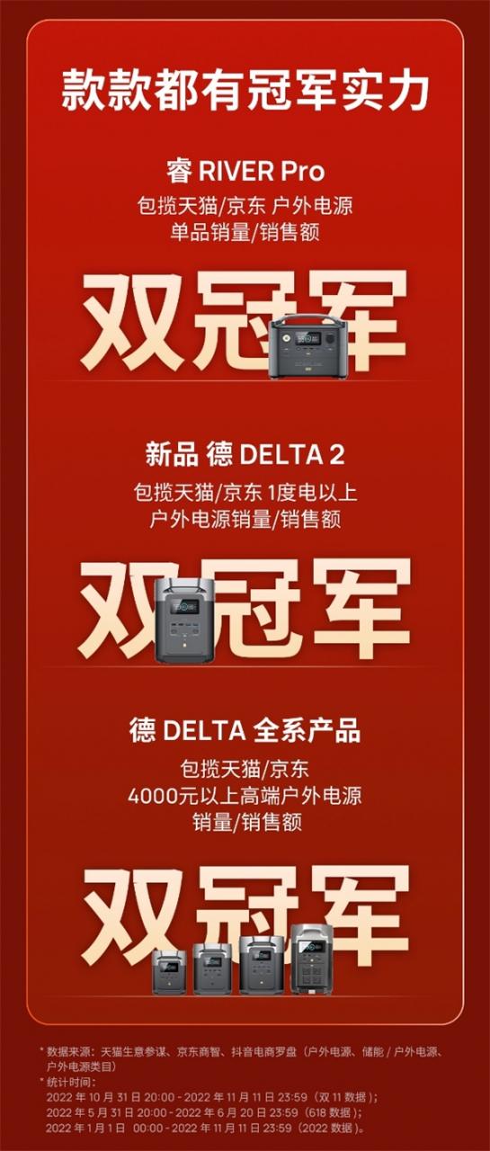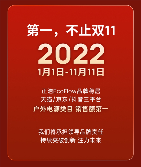 值得關注的是,據電商平臺數據顯示,2022年1月1日-11月11日,正浩EcoFlow穩居天貓、京東、抖音三大平臺戶外電源品牌類目銷售額第一,是2022年度戶外電源第一品牌。正浩EcoFlow積累已久的技術實力和產品口碑在這一年全面爆發,收獲更多用戶認可和選擇。